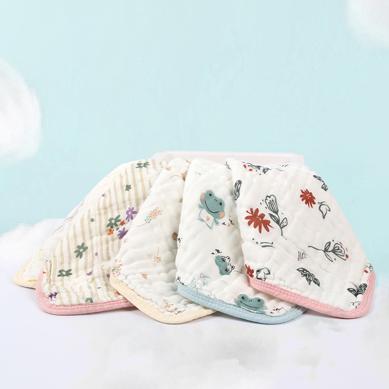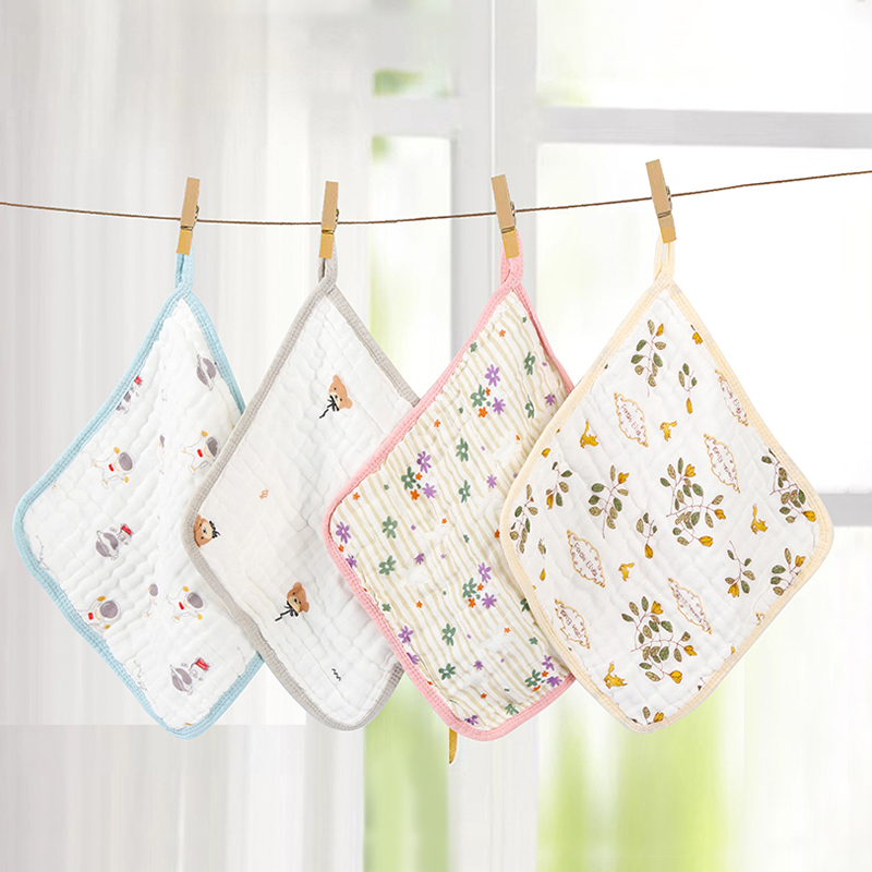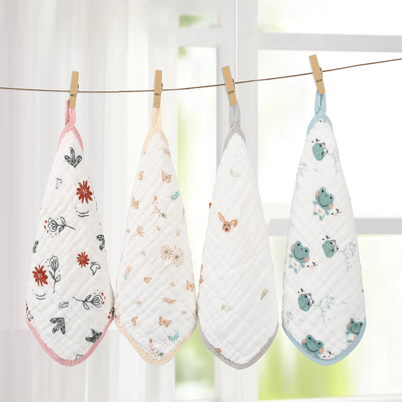 Colorful printed square towels are made of soft, skin-friendly pure cotton, offering a lightweight and comfortable feel. Their excellent absorbency allows for quick wiping away of baby's sweat and drool, keeping them dry and comfortable. The colorful binding around the edges is both durable and adds a fresh and bright visual effect. The surface is printed with fun cartoon patterns, lively and cute, attracting the baby's attention and making daily care more enjoyable. The hook design makes it easy to hang and store or grab, and it's also very convenient to carry when out. Combining practicality and aesthetics, these colorful printed square towels are an ideal choice for families, childcare, and outings, allowing your baby to spend every day in cool and comfortable condition.