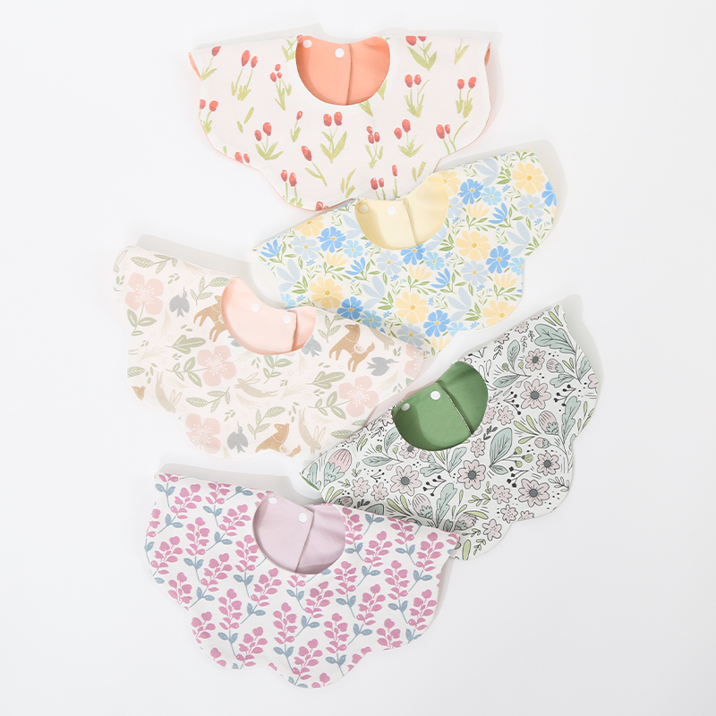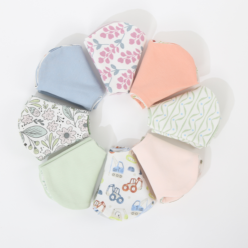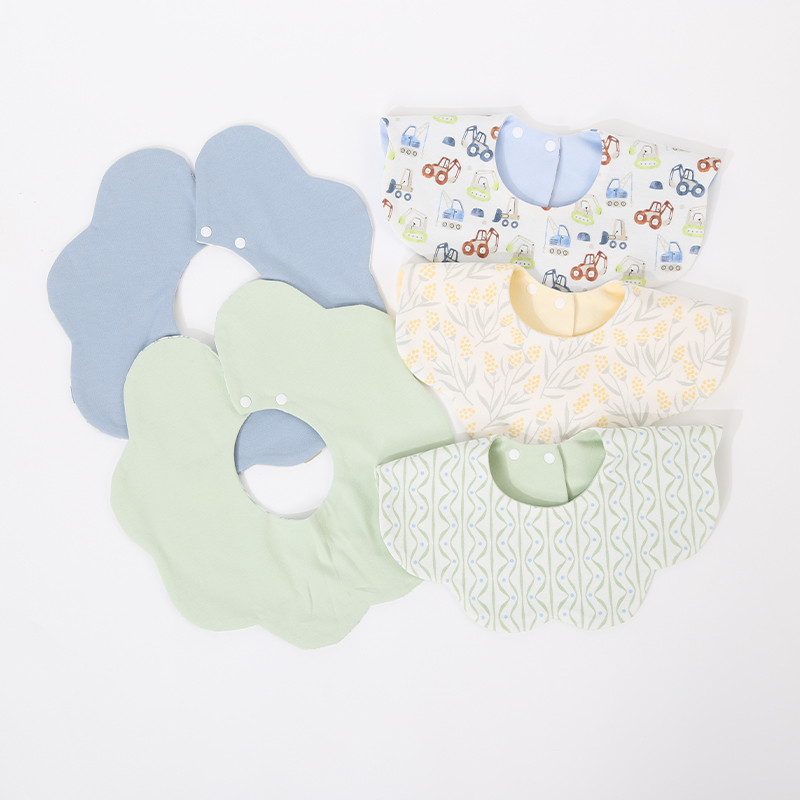 Knitted petal bib features a double-sided design: one side is beautifully printed, and the other is solid color, allowing for easy flipping and versatile use. The soft, skin-friendly fabric instantly absorbs drool and spilled food, drying quickly and preventing stuffiness, keeping your baby's chest dry and comfortable. The petal shape conforms to the curve of the neck and rotates 360 degrees for easy wrapping, adding fun and flexibility. Custom colors and patterns are available to meet individual needs, combining practicality and aesthetics. Whether for daily meals, outings, or photoshoots, this knitted petal bib provides comfortable protection for your baby, making every mealtime easy and enjoyable, and making baby care easier and more convenient for parents.