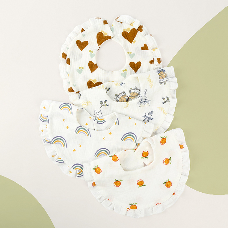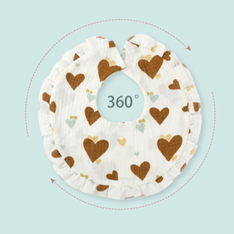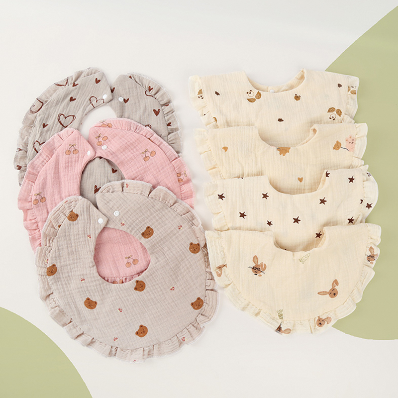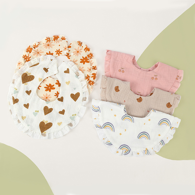 Round crocheted bib with lace trim is made of lightweight and soft crocheted fabric with a naturally wrinkled texture, offering a comfortable, skin-friendly, and breathable feel. The round design fits snugly around the baby's neck, providing complete coverage and preventing food or drool from wetting their clothes. Delicate lace trim adds a touch of cuteness and elegance while remaining durable and practical. The lightweight fabric is easy to wash and dry, making it suitable for everyday meals, outings, or photoshoots. This round crocheted bib with lace trim is both practical and stylish, keeping your baby dry and comfortable while feeding and making care easier for parents.